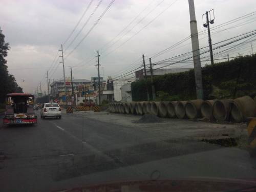 Unfinished drainage and roadworks along eastbound direction of Marcos Highway approaching Golden Meadows gate – note that materials occupy practically 2 lanes of the highway.
