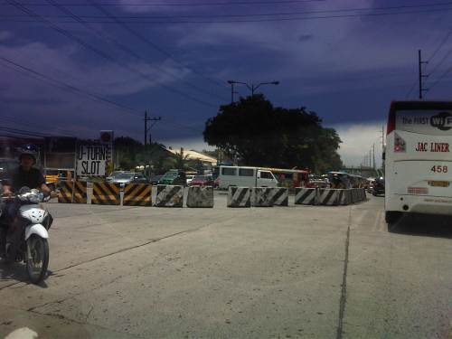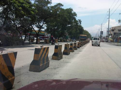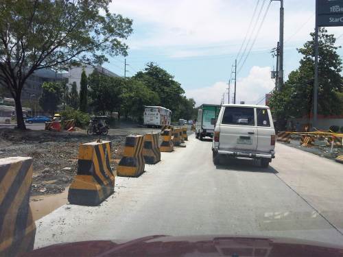 Concrete barriers delineating lanes intended for vehicles making a U-turn along Marcos Highway just after SM Masinag – the barriers are also meant to reduce weaving caused by vehicles generated by the mall and intending to make the U-turn. These barriers, however, are also hazards as vehicles accelerating after Masinag will suddenly encounter these without adequate warnings. At present the lane is blocked right after the median opening due to uncompleted roadworks. Thus, erroneously entering the leftmost lanes will require a U-turn. Such barriers would have to be removed so traffic can still opt to pass through the section.
