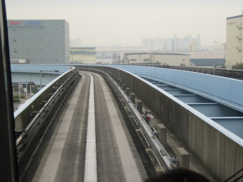 The Yurikamome is driverless (thus, automated). This is the view from the most coveted seats on the transit as the AGT approaches a station.