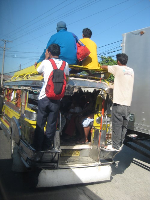 Passengers sitting on top and hanging behind a jeepney in GenSan