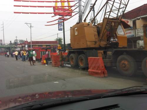 Crane deployed along westbound lane of Marcos Highway – Note the barriers and other equipment that effectively occupy about 2 lanes of the highway and the passengers waiting along the highway.