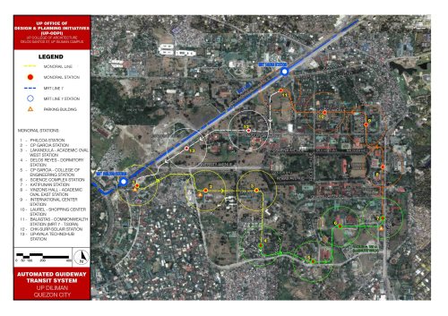 The prototype system will have several phases in order to complete a loop. It is to be designed as a one-track, and therefore likely a one-way system. The “rolling stock” of modified buses each with a capacity of 60 passengers are supposed to have already been finished and are being tested at the DOST compound in Bicutan. It is still not known what the capacity of the system will be since there have been no studies to support demand (i.e., ridership), which will be affected by factors such as the route, direction and headways. among others. The project is one that is technology-driven rather than demand-driven. It is going to be an experimental system and one that will probably have to be tweaked from time to time given that it will be “home-grown” and attempting to reduce costs commonly associated with existing systems in other countries. Below is one of the proposed alignments for the system showing the initial phase from Philcoa (in yellow). The circles indicate the 2-minute walking distance radius although this is a crude concept considering people will be walking along the roads or sidewalks and not necessarily along a straight line leading to the proposed stations.