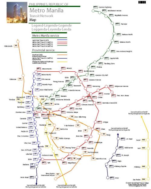 Being one who has lived in both Tokyo and Singapore where they have good public transportation systems, I could not help but become excited when, returning from Japan before the turn of the century I came upon plans for Metro Manila’s rail network. I was excited because the decade before I was first exposed to similar plans for MM at a time when other capital cities in Southeast Asia like Bangkok, Jakarta and Kuala Lumpur where also planning for their own mass transit systems. In fact, they were also planning expressways in their respective metropolitan areas (i.e., Bangkok Metropolitan Area or BMA and Jakarta-Bogor-Depok-Tangerang-Bekasi or Jabodetabek/Greater Jakarta). Flash forward to the present, it is frustrating, if not depressing, to see that Bangkok and Jakarta were able to implement many of their plans that were critical for the growth of these metropolitan areas and definitely contributed to the overall sustainable development in those countries. Granted, Bangkok and Jakarta still experiences congestion like the legendary jams along urban highways in Bangkok. But which city around the world does not experience congestion? The key is to provide a viable and more efficient (also convenient and comfortable) alternative to taking one’s car. That should be in the form of a mass transport system that is comprehensive enough that it will allow for both mobility and accessibility to the traveler/commuter. The following figure from the 2005 World Transit Maps envisioned a network that is still now unrealized and, for the existing lines, have become the subject of controversy and other issues that include the absence of a single ticketing system similar to the smart and octopus cards found in other countries.