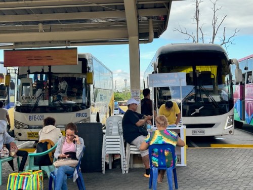 Buses at the public transport terminal at Robinsons Antipolo include those regularly dispatched to Cubao and Quiapo. There are many provincial and RORO buses including those bound for the Bicol Region and Eastern Visayas (i.e., Samar and Leyte). The latter are operated by several bus companies including RRCG whose buses are shown in the photo.