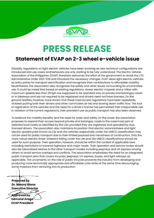 Most recently, the Electric Vehicle Association of the Philippines or eVAP released a statement regarding the proposed policies on electric vehicle use. Here is their press release, which is available from their official Facebook page: