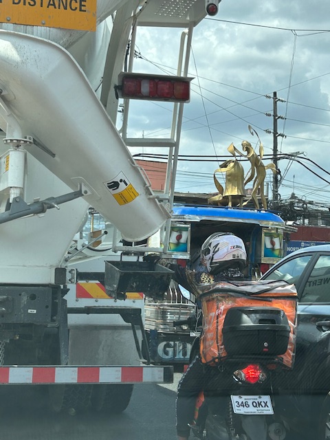 The not so obvious kamote rider positioning himself at the downspout of a concrete mixer.