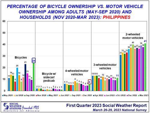 There is a nice graphic going around social media about bicycle and vehicle ownership in the Philippines. It is attributed to the Social Weather Stations (SWS), which conducted a survey on vehicle ownership in the country during the first quarter of 2023. Most conspicuous is the inclusion of bicycles considering that past national surveys (especially those conducted by the PSA or NSA) did not include bicycles but only motor vehicles in their surveys.
