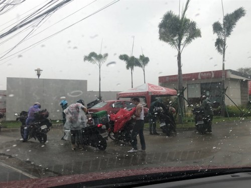 A common seen these days of the wet season are motorcycle riders stopping to take out their rain gear to wear so they can continue with their travels. I’m not surprised that many if not most already have their rain gear ready if it rained and they needed to use them. Oftentimes, the location would be under any shade or shelter including underneath footbridges, waiting sheds or trees. If there were nowhere to seek shelter, they change right in the open. Following is an example where riders stopped at a parking area of a residential development to don their raincoats and jackets.
