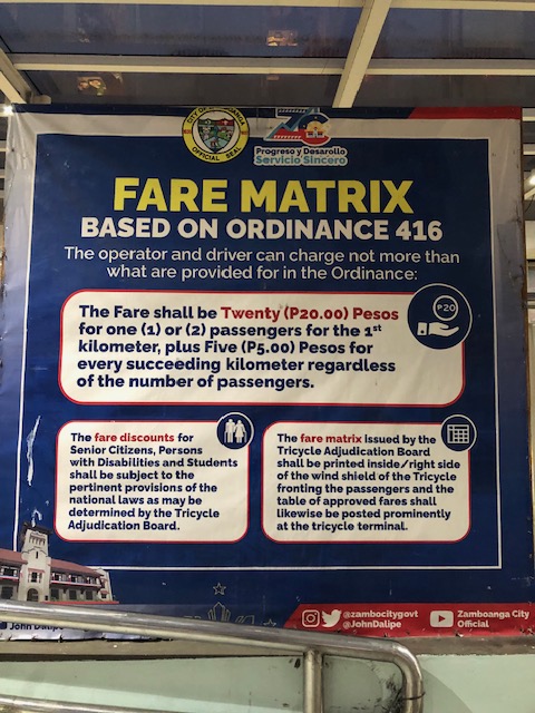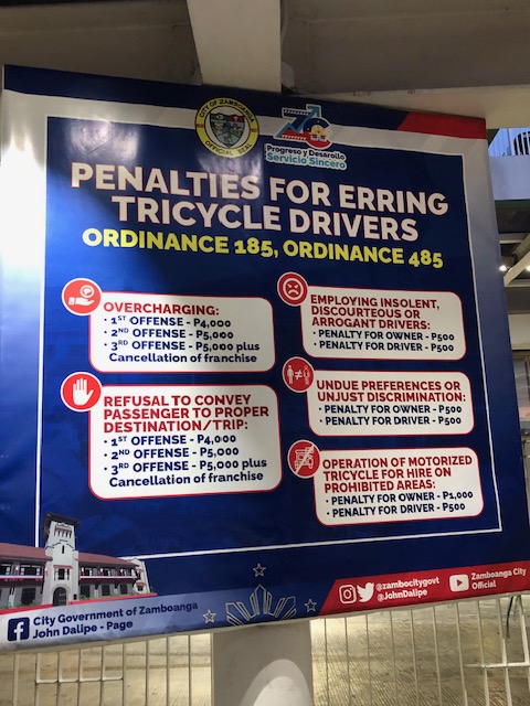 In a city like Zamboanga where there are many one-way streets, tricycle drivers can easily lengthen or appear to lengthen trips leading to overcharging of fares. Where tricycles do not have zones or areas of operations per TODA, this becomes the weakness or flaw even with ordinances in place for erring drivers and a simple fare matrix for passengers’ reference. Of course, regular commuters should be familiar with the usual fares they pay so perhaps that’s among the basis for knowing if you’re being overcharged. Visitors though will likely pay more if the driver consciously takes advantage of the situation. Again, this is a matter for enforcement of the ordinances passed by the city and an example of how such ordinances will be implemented.