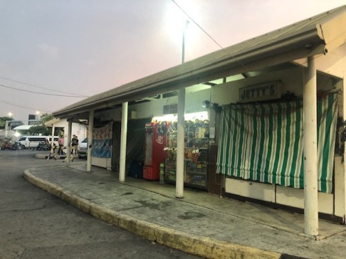 A single level building hosting stores selling food and drinks stands between the waiting area and the open parking lot.