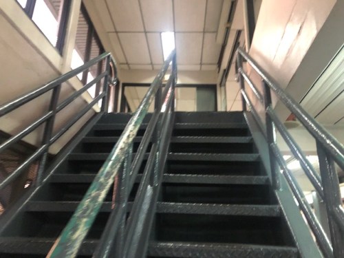 Stairs lead to the second level of the building for those who are waiting for arriving passengers (e.g., fetchers including relatives and friends).