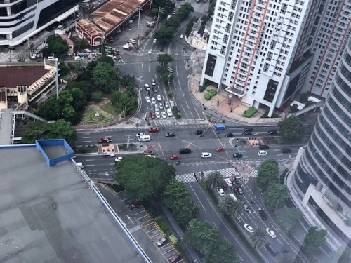 The weekend found us staying at a hotel in Makati in order to be near the recital venue for our daughter. Our room afforded a nice view of the surrounding areas (we were on the 29th floor) but the traffic engineer in me gave in to the temptation to take photos of a major intersection nearby – the Gil Puyat Avenue – Ayala Avenue intersection. These are two of the most prominent streets in the Makati CBD and strategically located at one corner is the Makati City Central Post Office and a stone’s throw away is the Makati City Central Fire Station. At another corner is the RCBC tower that hosts foreign embassies including the offices of the European Union.