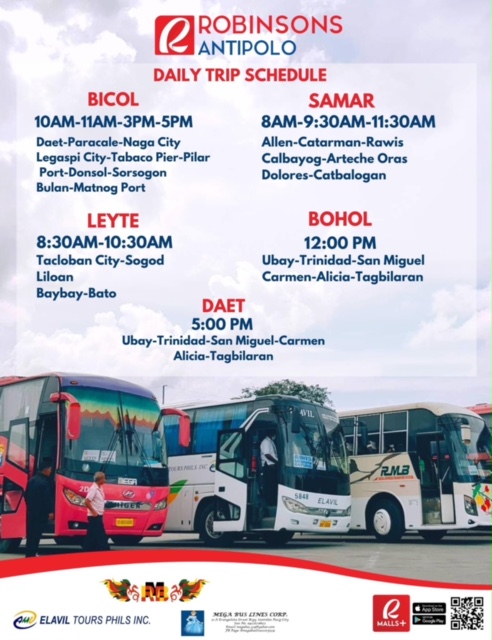 Robinsons Antipolo recently announced the daily trip schedule for provincial destinations for the transport terminal at the mall. These are for destinations in the Bicol region and the Visayan Islands of Samar, Leyte and Bohol. These will likely travel via Rizal’s “backdoor” through Teresa, Morong, Tanay and Pililla and proceed through the Laguna towns of Pangil, Pakil, Paete, Lumban and Pagsanjan, before going through Quezon province via Luisiana, Lucban towards Lucena, where there is a major bus. From Lucena, the trip will then take the usual routes through Bicol. Here is the posting from the Robinsons Antipolo Facebook page: