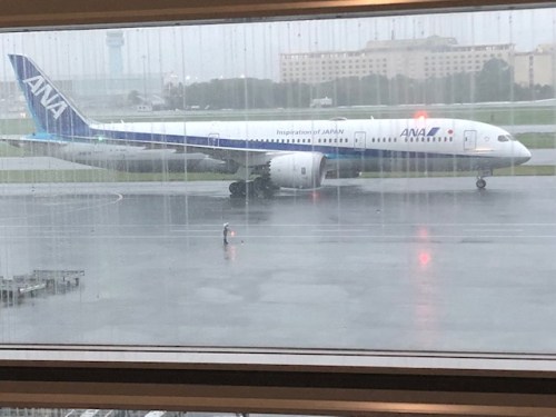 An earlier ANA flight arrived and departed without incident. This one arrived mid afternoon but was similarly grounded due to the typhoon.