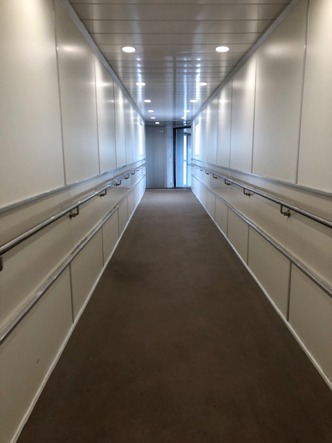 The hallway towards the terminal exit. The toilets are on the left side of the hallway.
