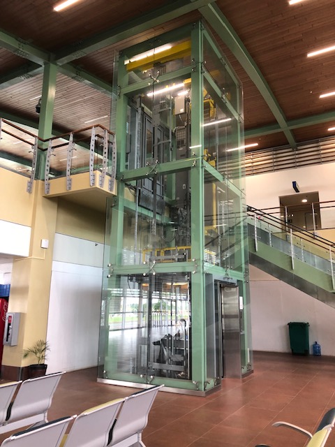 The elevator to the second level lounges and boarding gates.