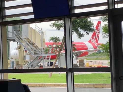 A view of an Air Asia plane that had just arrived and with its passengers just starting to deplane.