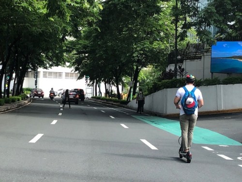 E-scooter in BGC: comfy clothes-check! backpack-check! helmet-check! Commuting to work should be something like this rather than most people using their cars.