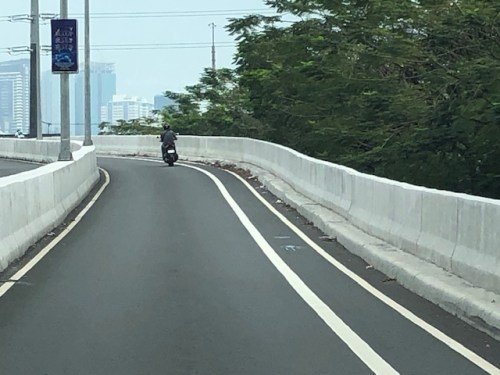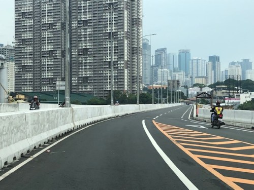 A motorcycle merges with the traffic from BGC. Notice the chevron markings separating merging flows as well as the yield marking for vehicles coming from Kalayaan (i.e., priority is for vehicles coming from BGC). The bridge from this section becomes two lanes per direction. There is, however, a risky part for cyclists who will cross paths with vehicles coming from Kalayaan. Cyclists from BGC will have to cross a lane to get to the bike lane on the outer side of the bridge. There is no space for pedestrians along this bridge.