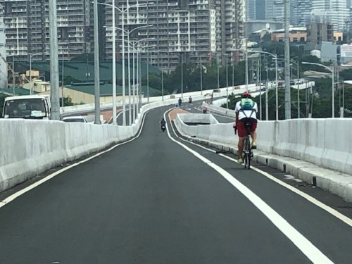 A lone cyclist traversing the bridge – the merge for traffic from BGC and vehicles from Kalayaan Avenue is seen downstream.