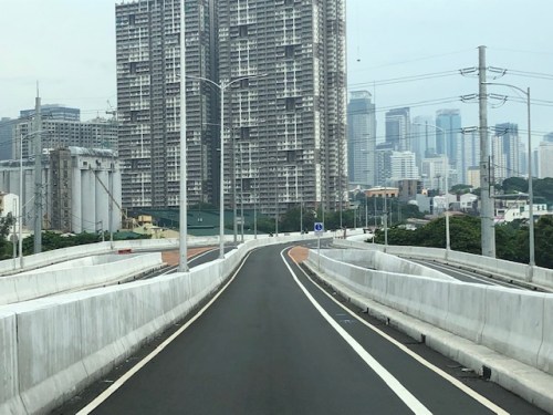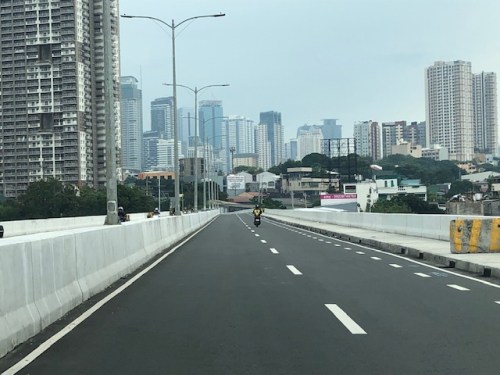 The view towards the Pasig side of the bridge. There are two lanes per direction and narrow bike lanes along the curbsides.