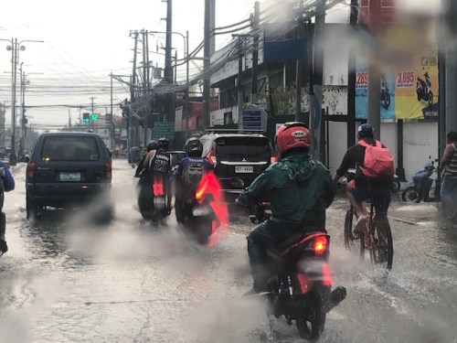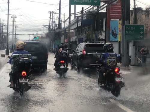 Motorcyclists emerge from their shelters to travel along flooded roads. A common sight when there are downpours are motorcyclists huddling under overpasses, bridges, or whatever shelter may be available to them. Many bring rain gear but opt to just stop and wait it out until the rain stops.
