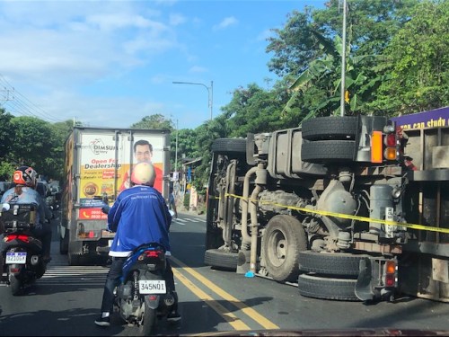It is fortunate that this did not result in any fatality but from the photos one can surmise the potential or likelihood of serious injuries if not death/s. Such underlines the importance of both proper maintenance and operations of these vehicles including how they are loaded. Shifting or unbalanced loads on moving trucks negotiating turns or maneuvering, for example, will result in loss of control and overturning that also leads to traffic congestion. Are the drivers competent, awake, alert? Or are they sleep or perhaps driving under the influence of alcohol or other substances?