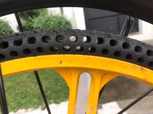 I had posted about the tires on my father-in-law’s newly acquired pedal assist electric bike. Here is what it looks like. Of course, rubber is still the basic material here so perhaps this will be replaced by more durable (indestructible?) material stated in the article above.