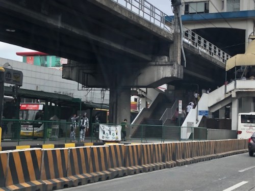 Buses queued before the Trinoma/North Avenue Station of the carousel. Overhead is the junction to the EDSA-MRT depot underneath Trinoma.