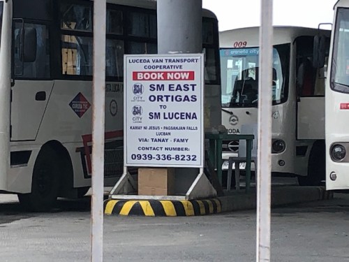 I was surprised to see a sign at the transport terminal of SM East Ortigas announcing van services between the mall and Lucena City (SM City Lucena terminal). This seems to be a very convenient service and it is via a route I consider to be quite scenic. This is the one via the “backdoor” of Rizal through the towns of Teresa, Morong, Tanay, Pililla in Rizal, Laguna province (Famy, Paete, Lumban, Pagsanjan, etc.) and Quezon province (Luisiana, Lucban, Tayabas).