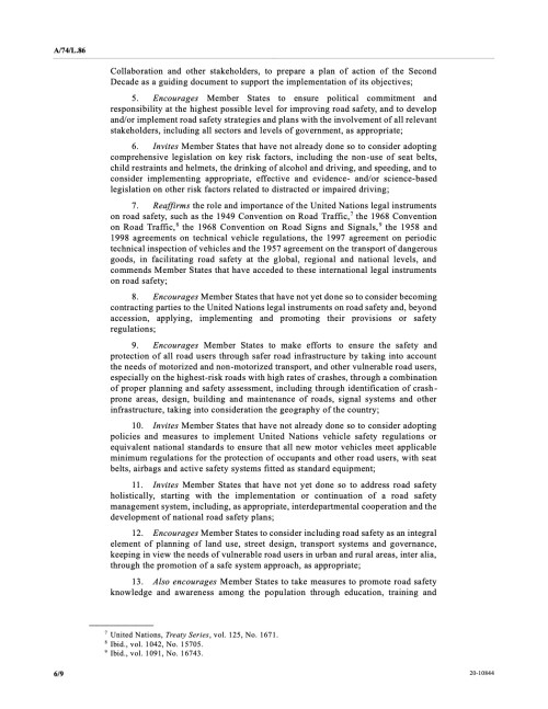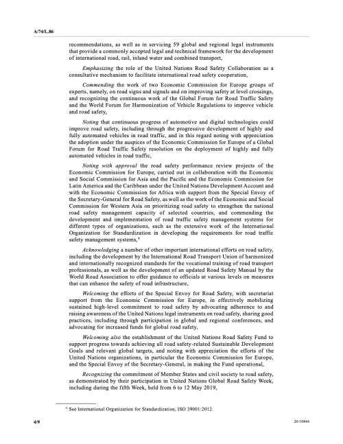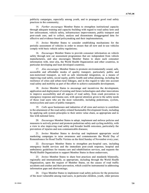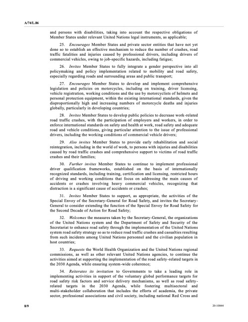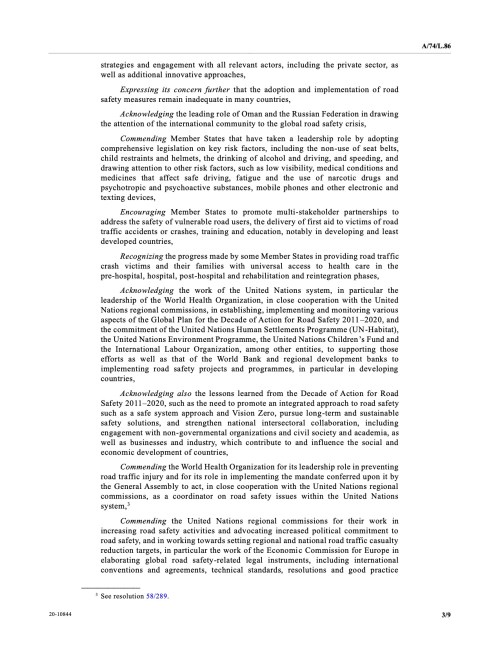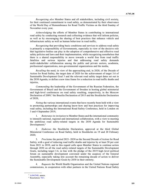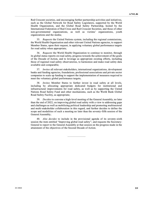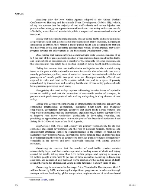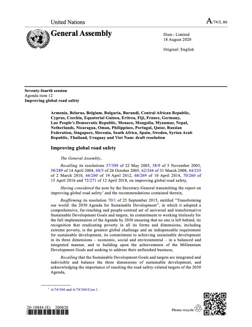 I’m posting here the 9-page resolution on road safety of the United Nations General Assembly that was recently (August 2020) passed by the body. This is the key resolution that launched a second Decade of Action for Road Safety, 2021-2030. The document may also be downloaded from the net. Here is a link to the document via the Asia Pacific Road Safety Observatory site: