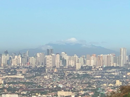 Mt. Mariveles in Bataan Province with cloud cover serves as a background for the Metro Manila cityscape.
