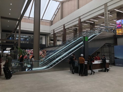 View towards the escalators to the arrival area, which is one level down from the departure area