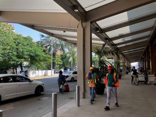 Workers walking along the newly completed pathways at the ground transport interphase for the departure area of the airport’s Terminal 1.
