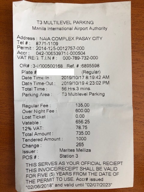 If you break down the total amount paid, 600 pesos went to the 2 overnights that I assumed to cover 48 hours of the total 56 hours and 3 minutes logged for the parked vehicle. The regular fee of 135 pesos covered the remaining 8 hours and 3 minutes. If the basic rate was 35 pesos for the first 3 hours and 20 pesos per succeeding hour, then that practically translates to the 135 pesos. I hope this helps my readers!
