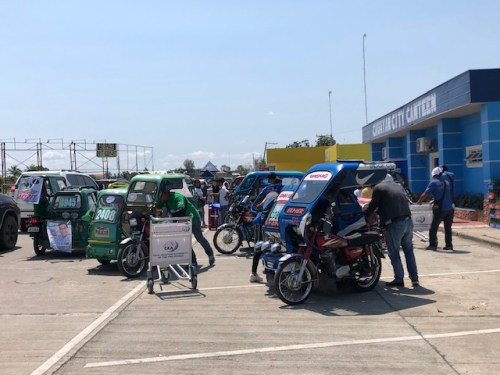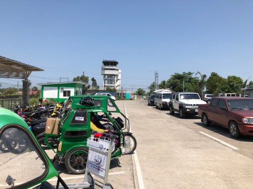 Tricycles, motorcycles and private vehicles parked at the airport. That’s the control tower in the background.
