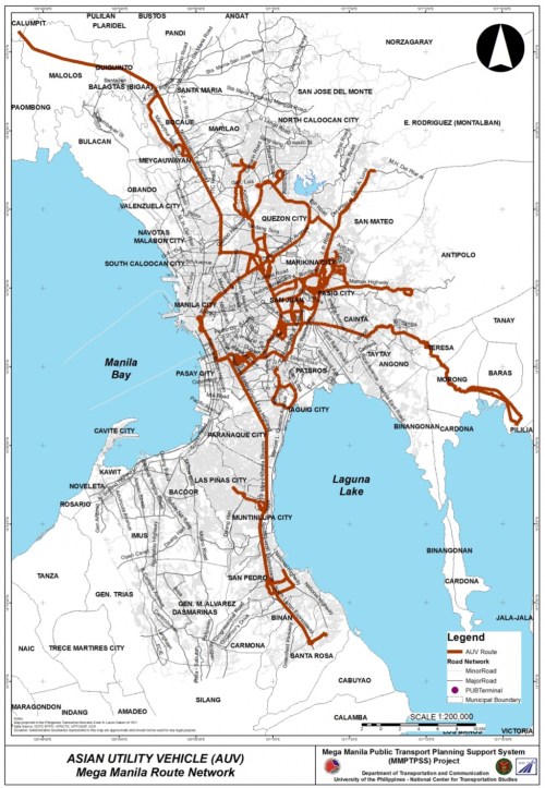 I saw several posts circulating on social media about public transport routes in major cities that included stylised maps presented like the transit maps you usually see for cities like Tokyo, Hong Kong and Singapore. These show what the makers identify as the equivalent of stops or stations along the public transport “lines”. These, of course, are a simplification because what appears as a single line may actually be comprised of several. Also, the overlaps seem to be also quite simplified compared to what may be found in reality. This post will not attempt to show how complicated road public transport is for Metro Manila. Instead, I am sharing the maps prepared from a previous study we conducted for the then DOTC (ca. 2012) that show the coverage of three road public transport modes: buses, jeepneys and UV Express.