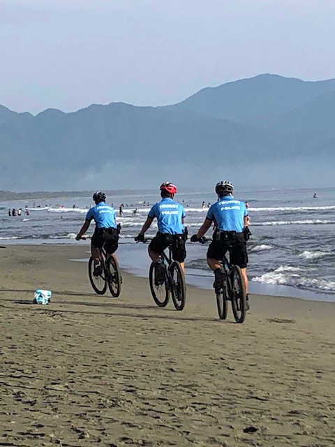 PNP officers on bike patrol along the beaches in Baler, Aurora