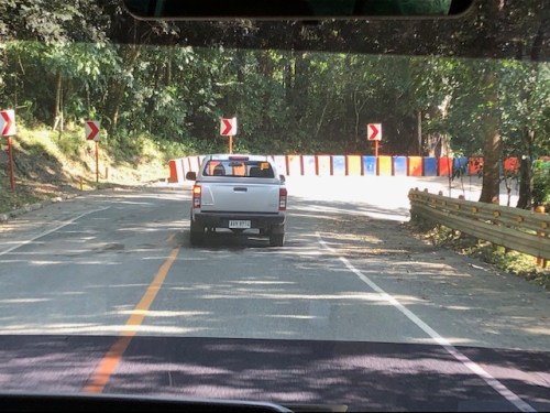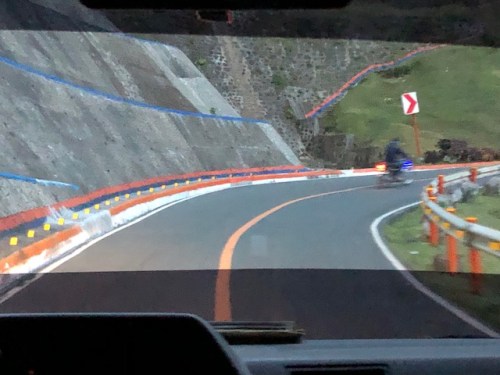 Here’s a photo of one of the more challenging sections. A team of flagmen manage traffic by giving turns to either direction, ensuring slower speeds and wider turning at the hairpin curve. Travelers often toss coins as a token of gratitude for these flagmen who man this challenging section of the national highway 24 hours/day.