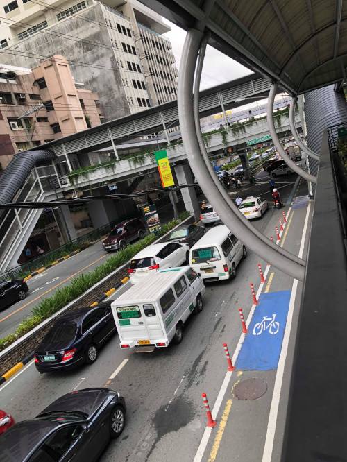 A view of the westbound bike lane along Julia Vargas at the Ortigas Center. Note that the eastbound bike lane (visible in this photo) is not similarly protected vs. motor vehicle encroachments. It would be preferable for that lane to be protected, too. Parang bitin pa tuloy ang effort nila.