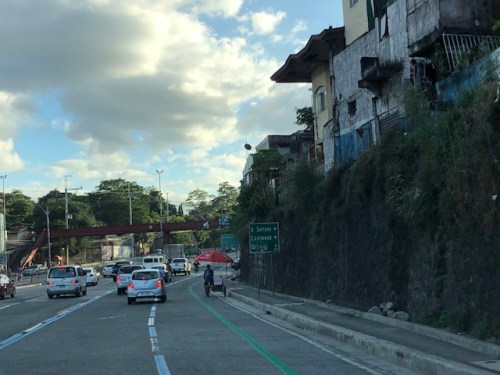 Here is the bike lane along the southbound side of Katipunan at the approach to Tuazon Avenue. That’s a pedicab on the bike lane so one can easily appreciate the dimensions particularly the width of the lane.
