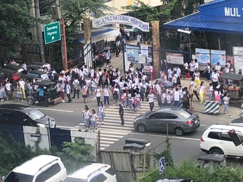 Most vehicles give way to people, especially students, crossing the busy street. There are usually traffic aides in the area who help manage traffic and to ensure pedestrians may safely cross or move about.