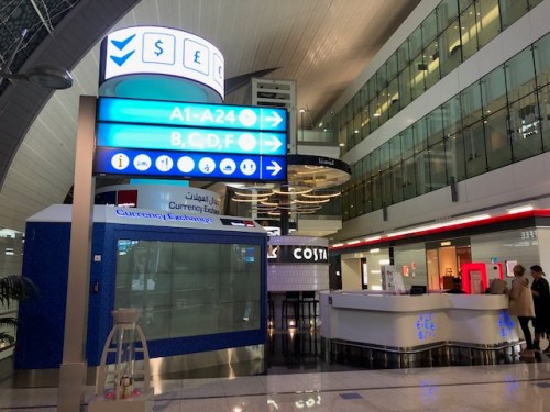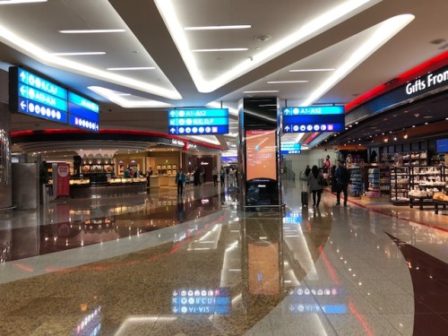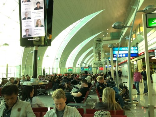 Arriving at Dubai en route to The Netherlands, we deplaned to be transported by bus to the airport terminal. Those of us bound for Europe boarded a different bus that took us to the terminal for what I assumed were for Europe-bound flights. This was good as we didn’t have to figure out the maze that was Dubai airport including passing through security and figuring out how to go to our designated boarding gate. Following are photos I took at Terminal A.