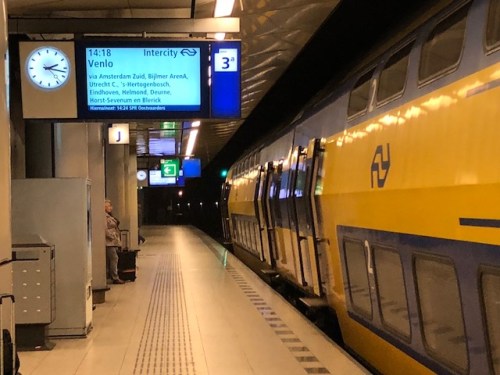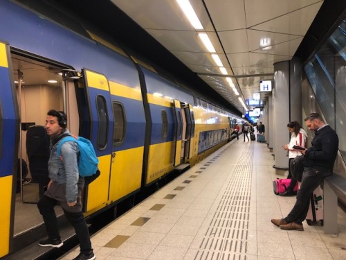 Passengers boarding or waiting at the platform of Schipol station