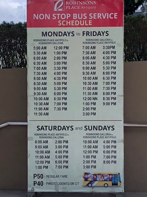 Schedule and fares for the P2P bus service between Robinsons Place Antipolo and Robinsons Galleria in Ortigas Center.