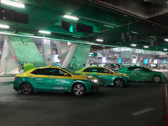 Typical regular taxis at Suvarnabhumi Airport. The large taxis are generally AUVs.