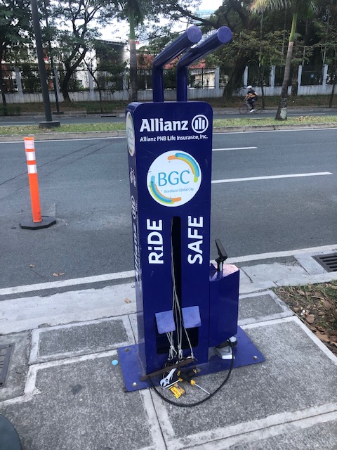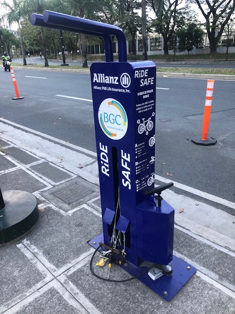 Walking along 38th Street at the Uptown side of Bonifacio Global City (BGC) in Taguig, I came along this mini bike repair station conveniently located along the bike lane and just across from the schools along the street. It had some tools and a pump. Typical of what a cyclist or biker may need in case some quick repairs, adjustments or tire inflation are required. The first time I saw something like this was along Commonwealth Avenue; provided by a bicycle group that helped promote bike-to-work along that corridor and Quezon City.