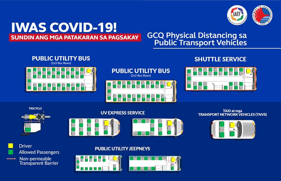 Here again, for reference, are the guidelines issued by the DOTr in relation to the transition from ECQ to GCQ and beyond (immediate rather than far future). The following images show the physical distancing prescribed for road transport.