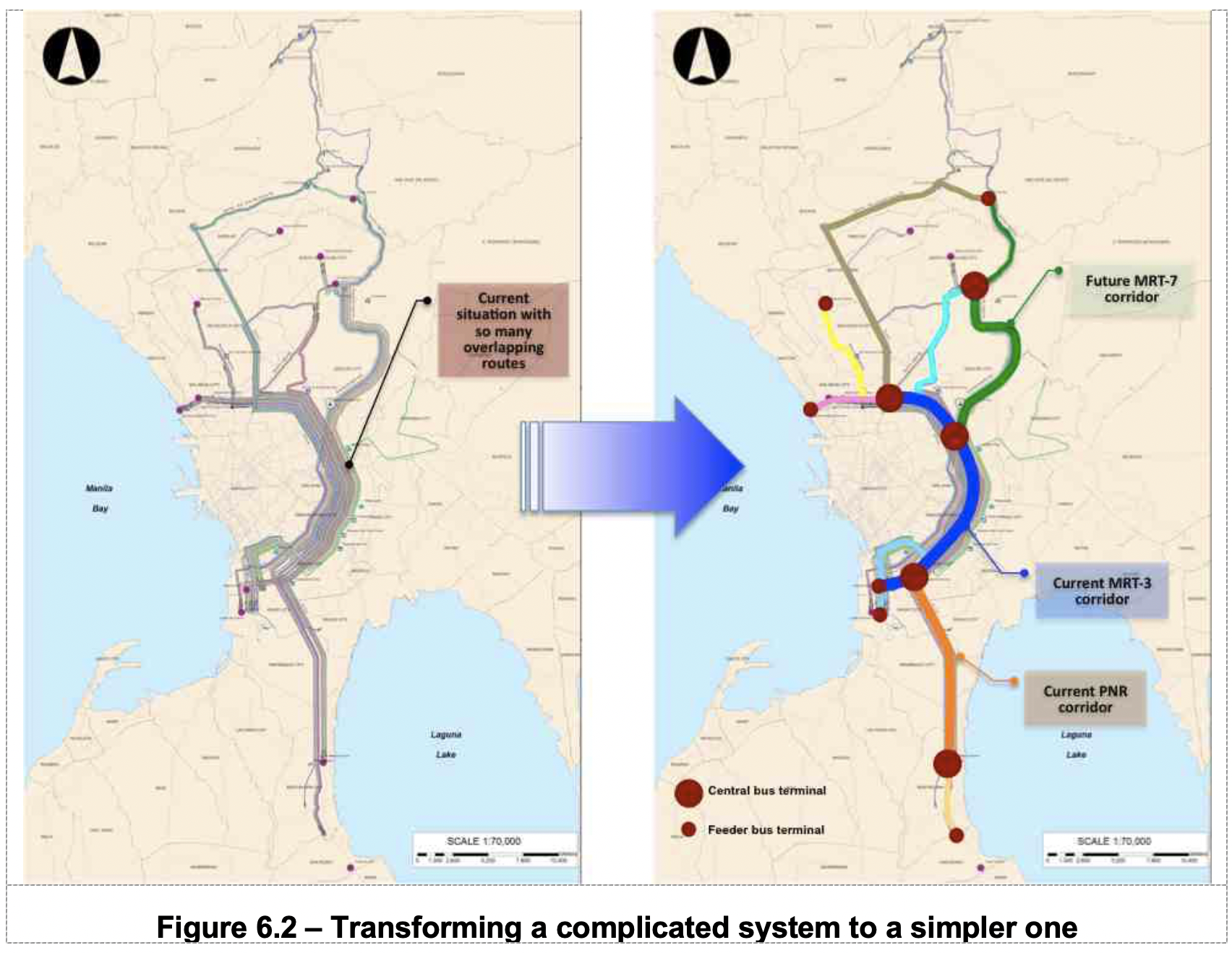 A friend posted this on social media as news came out about the government’s statement on its considering a single bus route for EDSA. EDSA, of course, is Circumferential Road 4 and perhaps the busiest road in Metropolitan Manila in terms of volumes of people and vehicles traversing this road. Public transportation along EDSA is mainly by buses and the MRT Line 3. Line 3’s capacity is already diminished despite the high demand for it mainly because of the number of train sets that are currently in operation. Buses, meanwhile, are split among the many routes converging along much of EDSA. These routes are shown in the map on the left where you can see the overlapping routes that have various end points.
