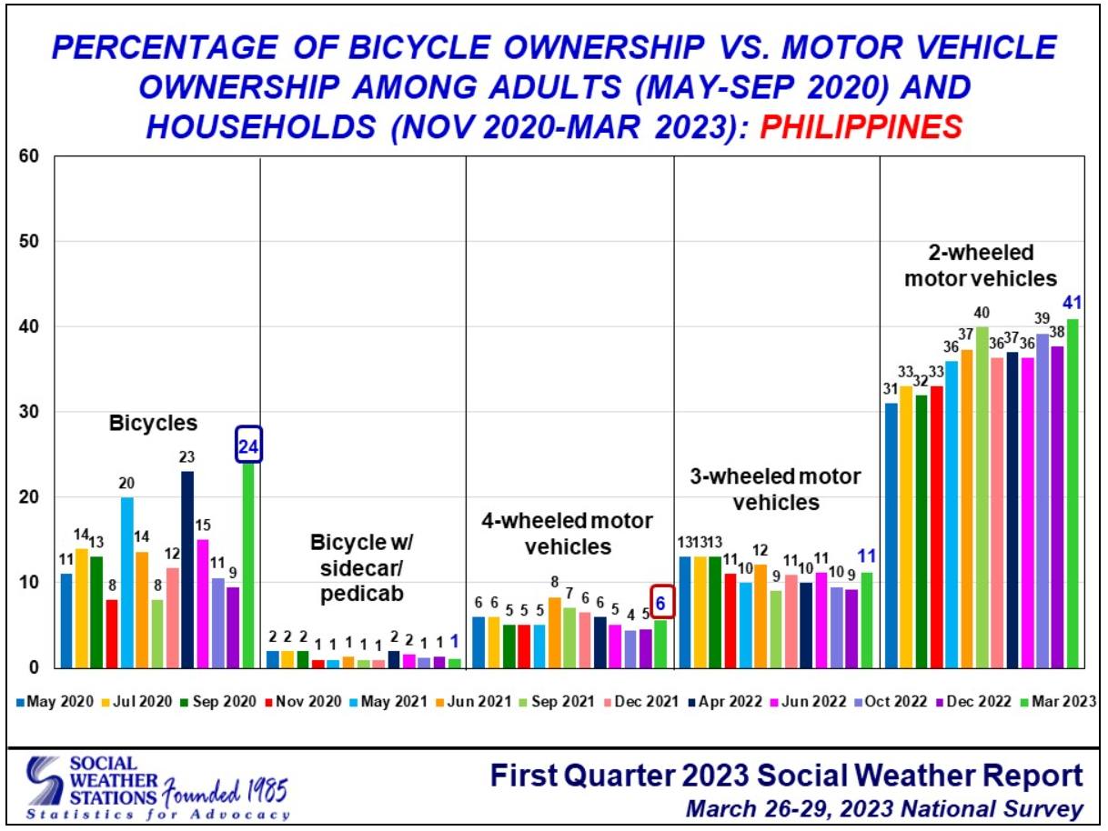 There is a nice graphic going around social media about bicycle and vehicle ownership in the Philippines. It is attributed to the Social Weather Stations (SWS), which conducted a survey on vehicle ownership in the country during the first quarter of 2023. Most conspicuous is the inclusion of bicycles considering that past national surveys (especially those conducted by the PSA or NSA) did not include bicycles but only motor vehicles in their surveys.